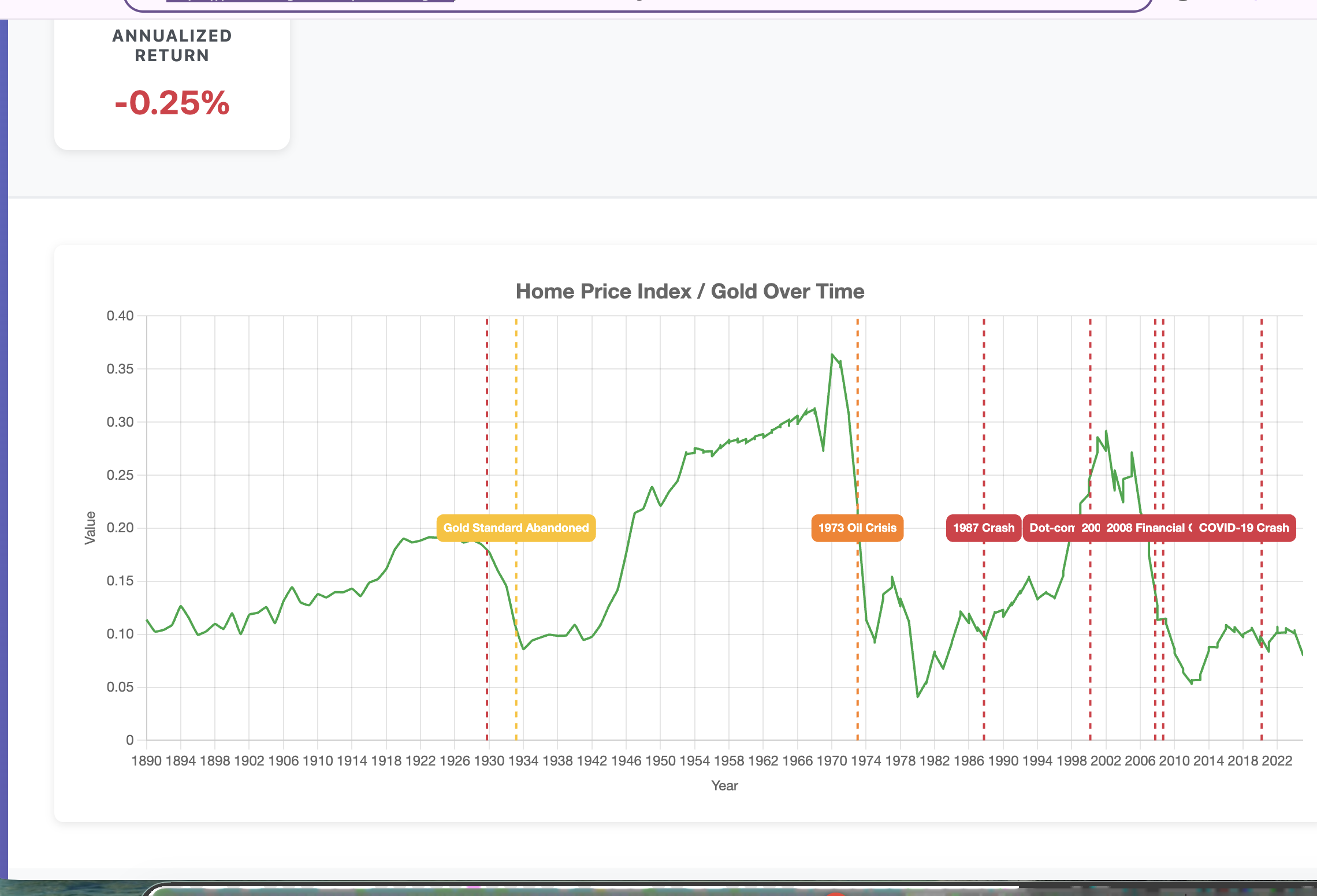 This visualization combines Robert Shiller's CAPE (Cyclically Adjusted Price-to-Earnings) ratio and home price data with historical gold prices to show relative valuations over time. The CAPE ratio helps identify periods of stock market overvaluation or undervaluation, while comparing it to gold provides additional context about real value.
